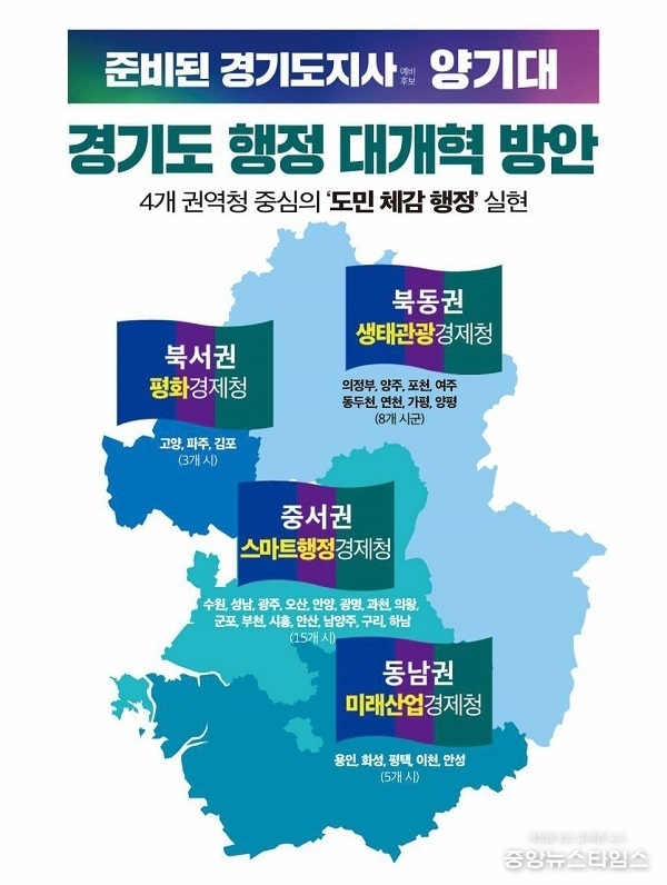 (중앙뉴스타임스 = 방재영 기자) 양기대 더불어민주당 경기도지사 예비후보가 경기도의 행정 체계를 4개 권역청 중심으로 재편하는 ‘경기도 행정 대개혁’ 구상을 강화했다.