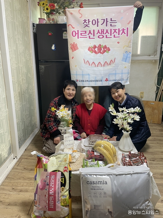 (중앙뉴스타임스 = 방재영 기자) 인천 중구 도원동 지역사회보장협의체(민간위원장 박영자)는 지난 20일 저소득 독거 어르신을 대상으로 ‘찾아가는 어르신 생신 잔치 지원 사업’을 실시했다.