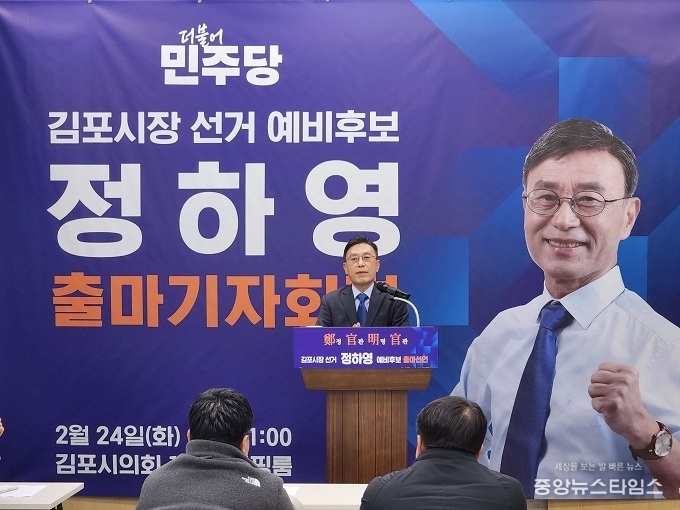 (중앙뉴스타임스 = 방재영 기자) 정하영 전 김포시장이 24일 김포시의회 브리핑룸에서 기자회견을 열고 오는 6월 3일 치러지는 지방선거에서 김포시장 출마를 공식 선언했다.