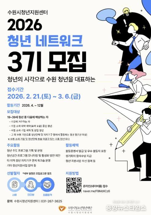 (중앙뉴스타임스 = 방재영 기자) 수원시청소년청년재단 수원시청년지원센터는 2월 21일부터 3월 6일까지 2026년 청년 네트워크 단원 32명을 모집한다.