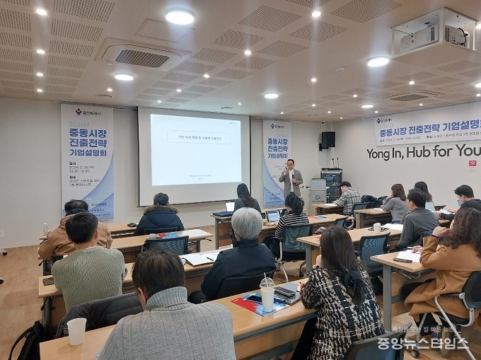 (중앙뉴스타임스 = 방재영 기자) 용인시산업진흥원은 26일 소공인·스타트업 허브에서 용인 소재 중소기업의 해외시장 진출 역량 강화를 위한 '2026년 중동시장 진출전략 기업설명회'를 개최했다고 밝혔다.