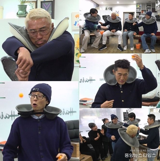 이날 유재석, 유연석, 추성훈, 김동현은 피지컬을 총동원한 한판 승부에 나선다. 이번 미션은 미용실 중화받침대로 탁구공을 받는 ‘핑퐁! 넥 캐치’. 네 사람은 목도리도마뱀을 연상케 하는 턱받이 장착 비주얼로 시작부터 웃음보를 자극한다. 이때 추성훈은 공만 띄웠다 하면 온몸으로 돌진, 야생 사자 같은 몸놀림으로 미용실을 발칵 뒤집는다. 급기야 추성훈이 공을 쫓던 나머지 카메라를 와락 덮쳐버리자, 유재석은 “오늘 조심해. 몇 명 박을 수도 있어”라며 안전을 당부해 폭소를 유발한다.