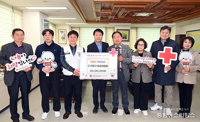 (중앙뉴스타임스 = 방재영 기자) 인천 부평구 통장연합회는 4일 나눔 문화 확산을 위해 대한적십자사 인천지사에 적십자 특별회비 330만 원을 전달했다.