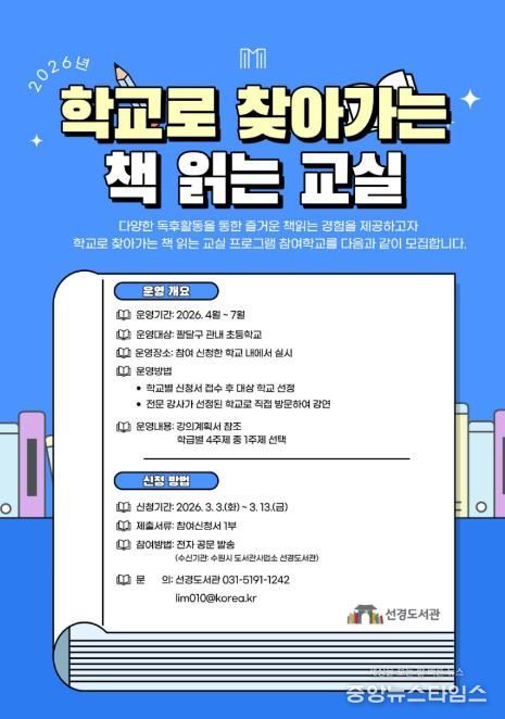 (중앙뉴스타임스 = 방재영 기자) 수원시 선경도서관은 ‘2026년 학교로 찾아가는 책 읽는 교실’에 참여할 팔달구 관내 초등학교를 13일까지 모집한다.