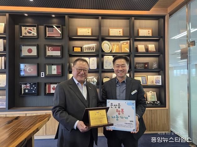 이학현 문산읍장은 “기업의 성장과 더불어 지역사회를 돌보는 사회적 책임을 실천해 주신 한울생약㈜에 깊이 감사드린다”라며 “이번 현판식이 나눔의 가치를 널리 알리고 더 많은 사업장이 동참하는 계기가 되길 바란다”라고 말했다.