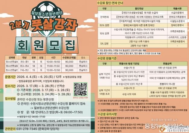 (중앙뉴스타임스 = 방재영 기자) 수원시청소년청년재단 칠보청소년청년센터는 지역 청소년들의 건강한 여가 생활과 체력 증진을 위해 2026년 2분기 문화강좌(풋살 교실)’수강생을 모집한다고 6일 밝혔다.