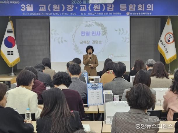 (중앙뉴스타임스 = 방재영 기자) 경기도광명교육지원청은 5일 광명교육지원청 3층 해오름실에서 2026 해오름 광명교육과 경기미래교육 구현을 위한 ‘2026년 3월 교(원)장, 교(원)감 통합회의’를 운영했다. 이번 통합회의는 학년 초 학교와 교육지원청, 도교육청 간의 협력을 강화하고, 학교 중심의 교육정책, 미래장학, 교육과정운영의 선순환 체제를 통해 학교 중심 행정 지원의 기틀을 마련하고자 진행됐다.