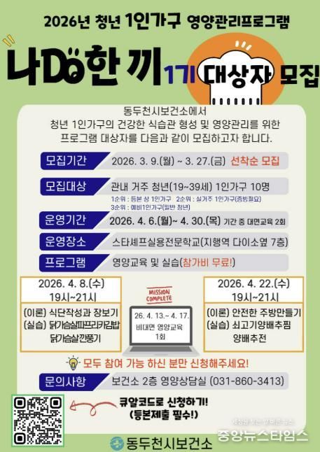 (중앙뉴스타임스 = 방재영 기자) 동두천시 보건소는 청년 1인 가구를 위한 맞춤형 영양 관리 프로그램 ‘나DO한끼’ 1기를 운영한다고 9일 밝혔다.