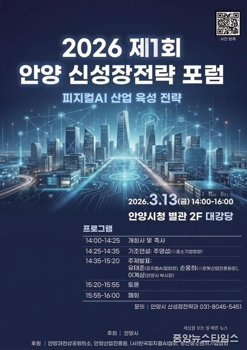 (중앙뉴스타임스 = 이광운 기자) 안양시는 미래 신산업 육성과 지역 산업 경쟁력 강화를 모색하기 위한 ‘2026 제1회 안양 신성장전략 포럼’을 오는 13일 오후 2시 안양시청 별관 2층 대강당에서 개최한다고 9일 밝혔다.