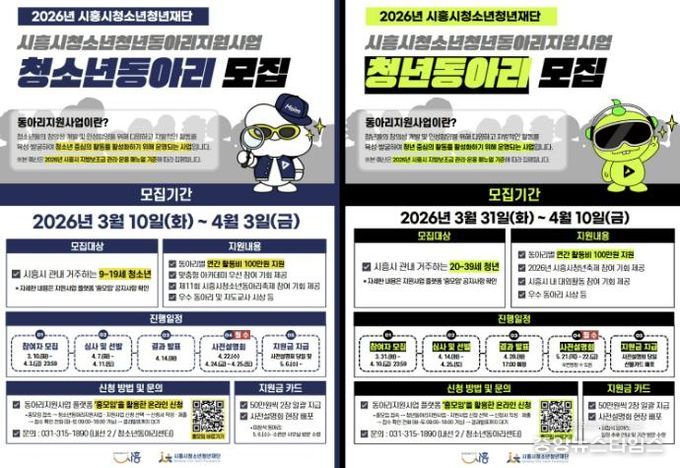 (중앙뉴스타임스 = 방재영 기자) 시흥시와 시흥시청소년청년재단은 지역 청소년과 청년의 자율적인 동아리 활동을 지원하고 건강한 문화 형성을 위해 ‘2026년 시흥시 청소년ㆍ청년 동아리 지원사업’에 참여할 동아리 670개를 모집한다고 10일 밝혔다.