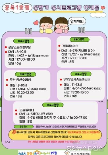 초등 프로그램은 △주산 암산 수리 셈 △성장 스트레칭 무용 △SNS 인싸 숏폼마스터로 운영되며, 유아 프로그램은 △그림책놀이 △사랑을 접다! 종이접기 △오감 놀이터로 진행된다.