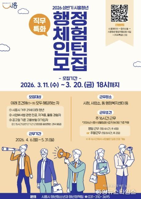 (중앙뉴스타임스 = 방재영 기자) 시흥시는 지역 청년들의 실질적인 일 경험과 진로 탐색을 지원하기 위해 ‘2026년 (직무특화) 상반기 행정체험 인턴 사업’을 운영하고, 11~20일까지 참여 청년 10명을 모집한다고 밝혔다.