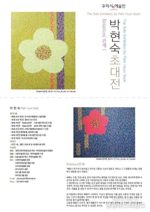 (중앙뉴스타임스 = 이광운 기자) 수원시 북수원도서관이 3월 22일까지 북수원도서관 1층 갤러리에서 ‘우리시 예술인 박현숙 초대전-관계(Relation)’를 개최한다.