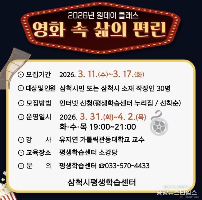 (중앙뉴스타임스 = 방재영 기자) 삼척시는 3월 31일부터 4월 2일까지 삼척시민 또는 관내 직장인을 대상으로 2026년 원데이 클래스 '영화 속 삶의 편린' 수강생을 모집한다고 밝혔다.