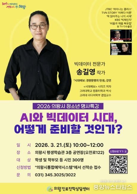 (중앙뉴스타임스 = 방재영 기자) 의왕시 진로진학상담센터가 3월 21일 오전 10시, 의왕시 평생학습관(오전로 122)에서 청소년과 시민을 대상으로 '2026 상반기 청소년 명사특강'을 개최한다.