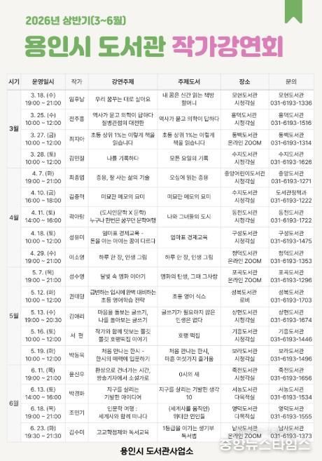 5월에는 7일 '명화의 탄생 그때 그 사람’의 저자 성수영 한국경제 기자(포곡도서관), 12일 '초등 영어 식스'의 저자 권태형 작가(성복도서관), 13일 '글쓰기가 필요하지 않은 인생은 없다'의 저자 김애리 작가(상현도서관), 16일 ‘호랭 떡집’의 저자 서현 작가(기흥도서관), 19일 ‘처음 만나는 한시 마흔 여섯가지 즐거움‘의 저자 박동욱 한양대 교수(보라도서관)가 강연할 예정이다.