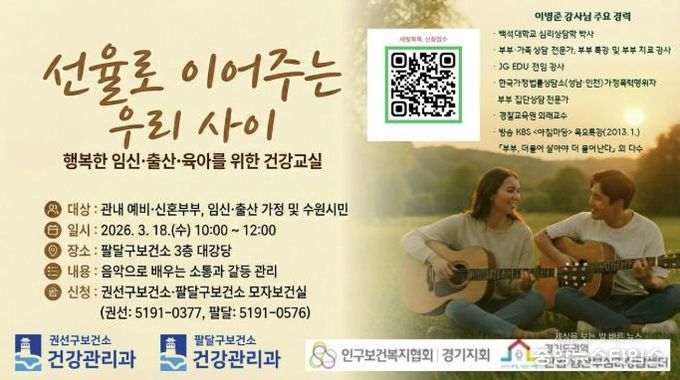 (중앙뉴스타임스 = 방재영 기자) 수원시보건소(권선·팔달)가 3월 18일 오전 10시 팔달구보건소 대강당에서 행복한 임신·출산·육아를 위한 건강교실 ‘선율로 이어주는 우리 사이’를 개최한다. 수원시 예비·신혼부부와 임신·출산 가정, 수원시민 누구나 참여할 수 있다.