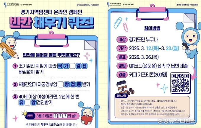 경기지역암센터가 주최하는 ‘제19회 암 예방의 날 기념 빈칸 채우기 퀴즈’는 3월 12일부터 3월 23일까지 진행되며 경기도민 누구나 참여할 수 있다.