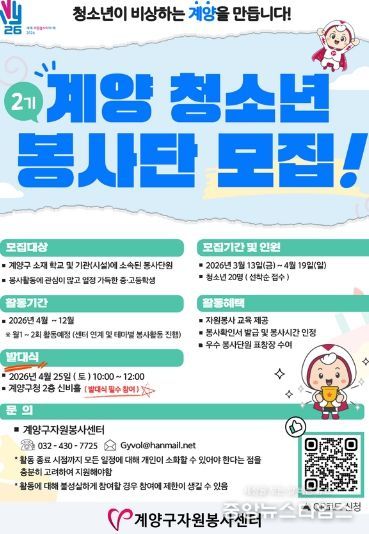 모집 기간은 3월 13일부터 4월 19일까지이며, 계양구 소재 학교 또는 기관에 소속된 청소년과 봉사활동에 관심이 있는 중·고등학생 등 총 20명을 선착순 모집한다.