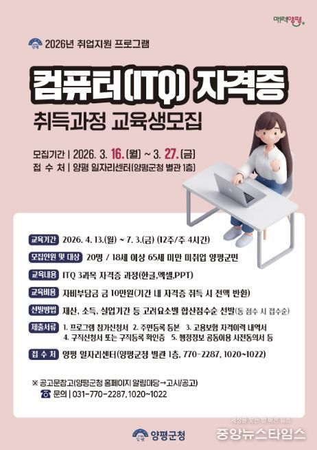 (중앙뉴스타임스 = 방재영 기자) 양평군은 오는 16일부터 디지털 기반 업무 환경에 대응할 수 있는 실무형 인재 양성과 지역 일자리 창출을 위해 2026년 취업지원 프로그램 ‘컴퓨터(ITQ) 자격증 취득과정’ 교육생을 모집한다고 12일 밝혔다.