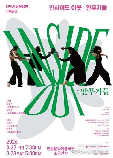 'Inside Out : 안무가들'은 오는 3월 27일과 28일 이틀간 인천문화예술회관 소공연장에서 공연되며, 청년문화예술패스, 예술인 할인 등 다양한 관람 할인 혜택도 제공한다.