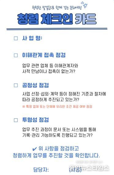 체크인 카드에는 ▲이해관계자와의 사적 접촉 여부 ▲사업 추진 과정의 공정성 ▲부당청탁 발생 여부 ▲업무 추진 과정의 기록 및 관리 가능 여부 등 업무 추진 시 점검해야 할 청렴 항목이 포함돼 있으며, 담당자가 업무 시작 단계에서 간단히 확인하도록 구성됐다. 특히 문화관광 분야는 민간단체 및 업체와의 협업이 많은 만큼, 이번 시책을 통해 업무 초기 단계에서 청렴 위험 요소를 점검함으로써 부패 발생 가능성을 사전에 예방하는 데 목적이 있다.