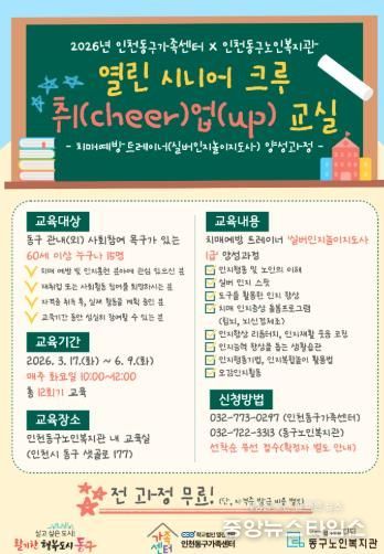 (중앙뉴스타임스 = 방재영 기자) 인천동구가족센터는 오는 17일부터 60세 이상 주민을 대상으로 치매예방 트레이너 양성과정인 ‘열린 시니어 크루 취(cheer)업(up) 교실’을 운영한다고 13일 밝혔다.