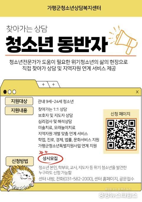 (중앙뉴스타임스 = 방재영 기자) 가평군청소년상담복지센터는 청소년 상담 분야 자격과 경험을 갖춘 전문상담사가 위기 청소년을 지원하는 ‘청소년동반자 프로그램’을 운영중이라며 적극적인 이용을 당부했다.