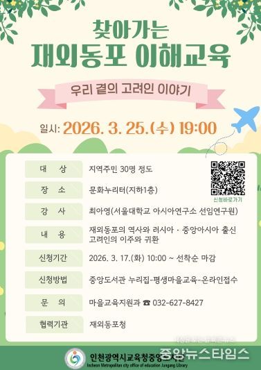 (중앙뉴스타임스 = 방재영 기자) 인천광역시교육청중앙도서관은 오는 17일부터 찾아가는 재외동포 이해교육 ‘우리 곁의 고려인 이야기’ 참여자를 모집한다.