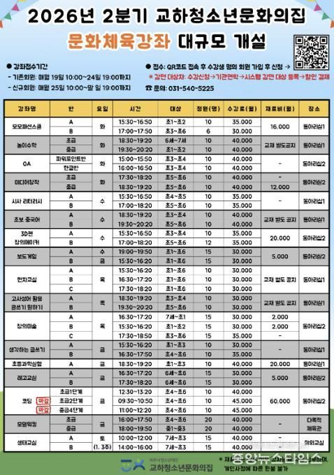 이와 함께 기존에 안정적으로 운영되며 높은 만족도를 보여준 ▲창의미술 ▲한자교실 ▲레고교실 ▲코딩 ▲생태교실 강좌 역시 지속적으로 운영되어, 청소년들에게 한층 더 넓고 깊이 있는 선택의 폭을 제공할 예정이다.