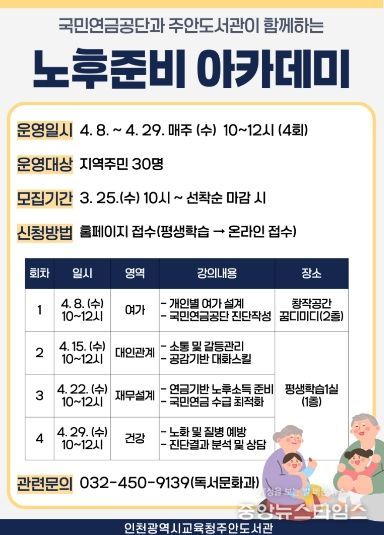 (중앙뉴스타임스 = 방재영 기자) 인천광역시교육청주안도서관은 시민들의 체계적인 노후 설계를 지원하기 위해 '노후준비 아카데미' 참여자를 모집한다.