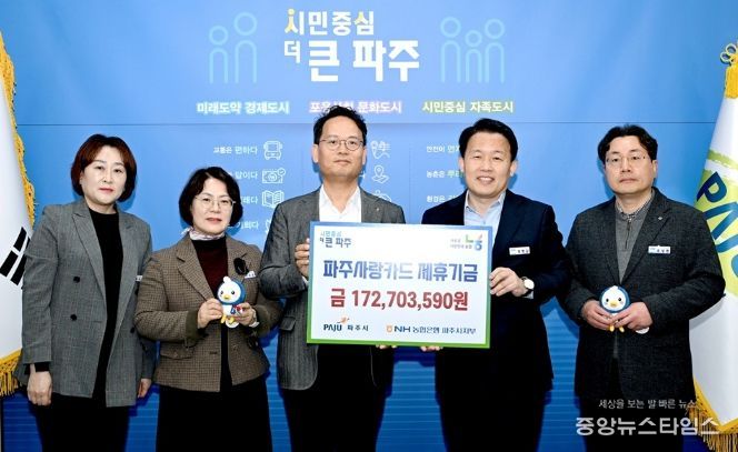 (중앙뉴스타임스 = 방재영 기자) 파주시는 지난 18일 엔에이치(NH)농협은행 파주시지부로부터 지난해 적립된 제휴카드 적립기금 172,703,590원을 전달받았다.