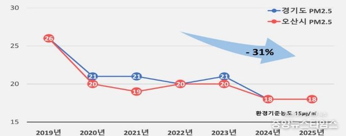 시에 따르면 오산시의 초미세먼지 연평균 농도는 2019년 이후 경기도 평균 수준을 유지하고 있으며, 보다 쾌적한 대기환경 조성을 위해 지속적인 관리와 개선 노력을 이어가고 있다. 시는 2026년 초미세먼지 연평균 농도 17㎍/㎥ 달성을 목표로 총력을 기울일 방침이다.