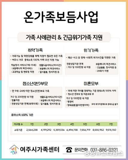 (중앙뉴스타임스 = 방재영 기자) 여주시가족센터는 복합적인 어려움을 겪는 가족을 발굴하고 지원하기 위해, 2026년 ‘취약·위기가족 지원사업(온가족보듬사업)’을 예년보다 확대하여 본격 가동한다고 밝혔다.
