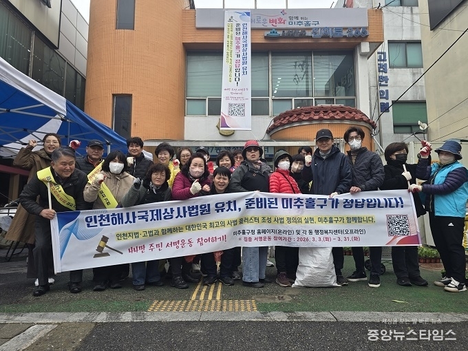 (중앙뉴스타임스 = 방재영 기자) 인천 미추홀구 주안7동 행정복지센터(동장 강무희)는 지난 18일 신기시장 사거리에서 ‘인천해사국제상사법원(이하 해사법원) 미추홀구 유치’를 위한 주민 서명운동 캠페인을 진행했다.