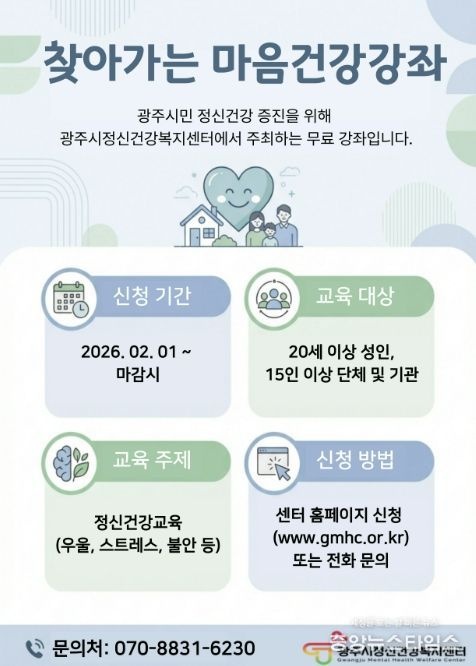 (중앙뉴스타임스 = 방재영 기자) 광주시정신건강복지센터는 지역 내 기관 및 단체를 대상으로 정신건강 인식 향상과 정신질환 예방을 위한 ‘2026년 찾아가는 마음 건강 강좌’를 오는 11월까지 운영한다고 20일 밝혔다.