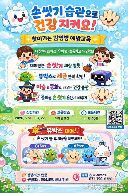(중앙뉴스타임스 = 방재영 기자) 하남시보건소는 오는 4월 6일부터 10월 2일까지 관내 어린이 대상 ‘손 씻기 교육’을 운영하며, 3월 20일부터 27일까지 관내 교육기관을 대상으로 네이버 폼을 통해 교육 신청을 받는다고 밝혔다.