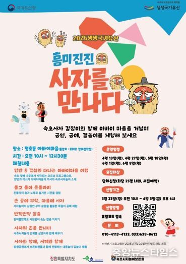 속초시 관계자는 “이번 사업은 지역 전통문화를 단순 관람이 아닌 체험 중심으로 즐길 수 있도록 구성했다”며 “시민과 관광객들이 속초의 국가유산을 보다 가까이에서 경험하는 계기가 되길 바란다”고 말했다.