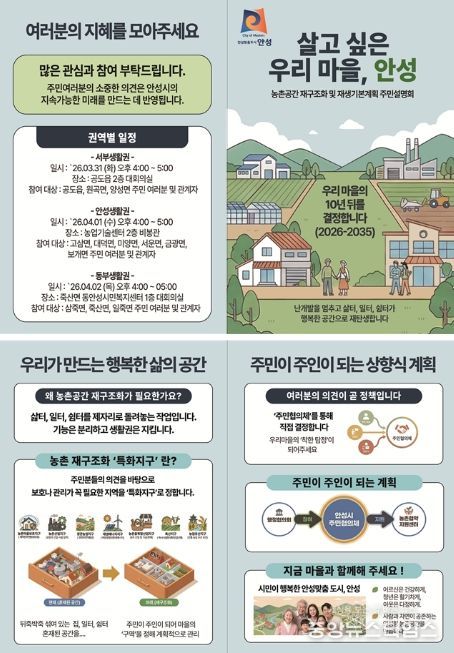 (중앙뉴스타임스 = 방재영 기자) 안성시는 농촌 지역의 체계적인 정비와 지속 가능한 발전을 위한 ‘농촌공간 재구조화 및 재생 기본계획’ 수립과 관련하여, 지역 주민의 생생한 목소리를 듣기 위한 주민설명회를 개최한다고 24일 밝혔다.