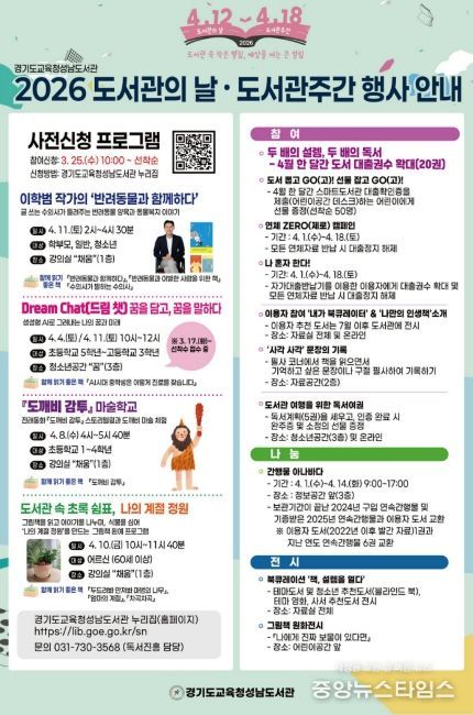 (중앙뉴스타임스 = 방재영 기자) 경기도교육청성남도서관이 2026년 도서관의 날(4월 12일)과 도서관 주간(4월 12일~18일)을 맞아 다양한 독서·문화행사를 운영한다.