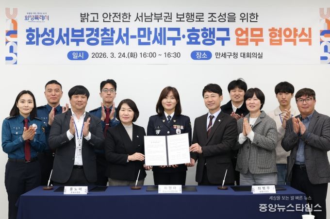 (중앙뉴스타임스 = 방재영 기자) 화성특례시 만세구는 24일 만세구청 대회의실에서 화성서부경찰서, 효행구청과 함께 ‘밝고 안전한 서남부권 보행로 조성을 위한 업무협약(MOU)’을 체결했다고 밝혔다.