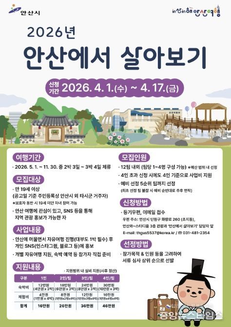 시는 총 12개 이내로 참여 팀을 선발할 예정이며, 최종 선정 결과는 4월 30일 발표된다. 선정된 참여팀은 5월부터 11월까지 기간 중 2박3일 또는 3박4일 일정으로 안산을 자유롭게 여행하고, SNS에 홍보 콘텐츠를 게시하면 숙박비와 체험비를 지원받는다.
