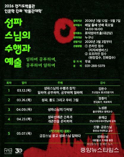 또한, 경기도박물관은 본 전시와 연계해 ‘성파스님의 수행과 예술-일하며 공부하며, 공부하며 일하며’를 주제로 인문학강좌(5회)를 마련했다. 3월 26일에는 ‘성파, 통도 그리고 우리 그림’이라는 주제로 정종미 한국화가가 미술재료를 탐구하는 강의를 진행한다. 자세한 내용은 경기도박물관 누리집(musenet.ggcf.kr) 참고.
