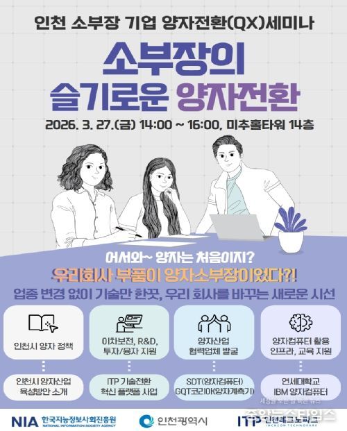 (중앙뉴스타임스 = 방재영 기자) 인천광역시는 3월 27일 송도 미추홀타워에서 지역 소재·부품·장비(소부장) 기업을 대상으로 '양자전환(QX) 세미나'를 열고, 양자기술 기반 산업 적용과 기업 간 협력 네트워크 구축 방안을 모색했다.