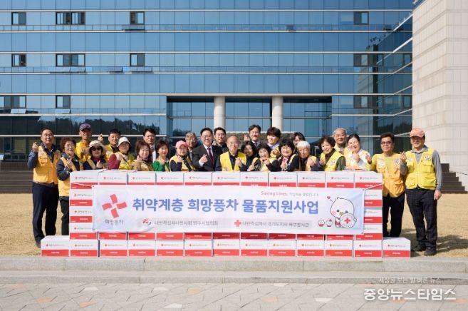 (중앙뉴스타임스 = 방재영 기자) 대한적십자사봉사회 양주시협의회(회장 정진수)는 지난 25일 시청 원형광장 앞에서 ‘희망풍차 물품 전달식’을 개최했다.