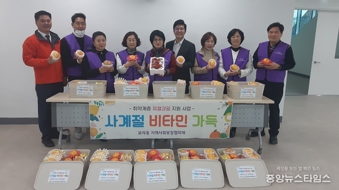 보라동 지역사회보장협의체는 27일 취약계층 25가구에 과일과 반찬을 전달했다. 이날 협의체 위원들은 지원 대상 가정을 방문해 딸기, 사과, 천혜향 등 과일 7종으로 이뤄진 과일상자 10상자와 반찬 15인분을 전달했다. 연말까지 주기적으로 취약계층에 제철 과일과 반찬을 전달하고, 안부 확인과 가정 내 환경미화 등 봉사활동을 할 예정이다. 박 위원장은 “최근 물가가 너무 올라 과일을 마음 놓고 살 수 없는 어려운 이웃이 많아 이번 사업을 추진했다”며 “대상자분들이 제철에 나는 과일을 맛있게 드시고 건강하시기를 기원한다”고 말했다.