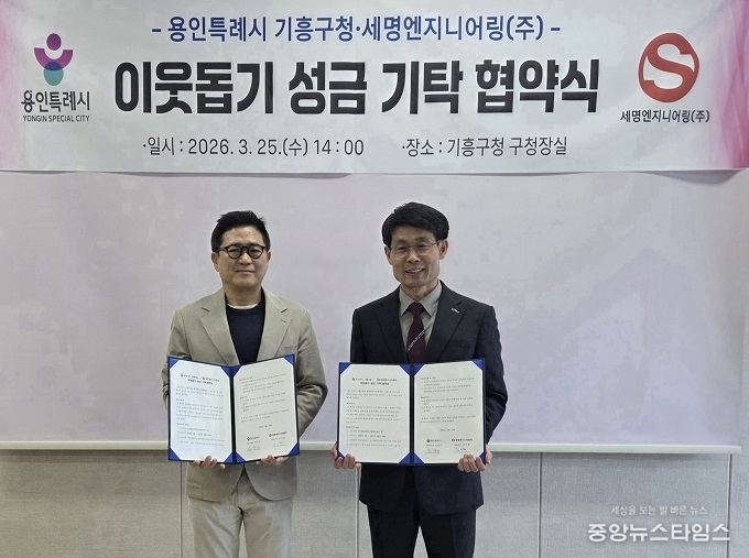 기흥구는 지난 25일 구청장실에서 세명엔지니어링㈜과 ‘이웃사랑 성금 정기 기탁’을 위한 협약을 했다. 세명엔지니어링㈜은 오는 4월부터 매달 성금 100만 원을 기탁해 지역 내 취약계층 가정 지원과 복지사각지대 해소를 위한 다양한 사업에 동참한다. 김석현 대표는 “기업의 성장에는 지역사회의 응원과 신뢰가 큰 힘이 됐다”며 “앞으로도 지역 주민과 함께 성장하는 기업으로서 사회적 책임을 다하고, 지속적인 나눔을 통해 따뜻한 기흥을 만드는 데 힘을 보태겠다”고 했다.