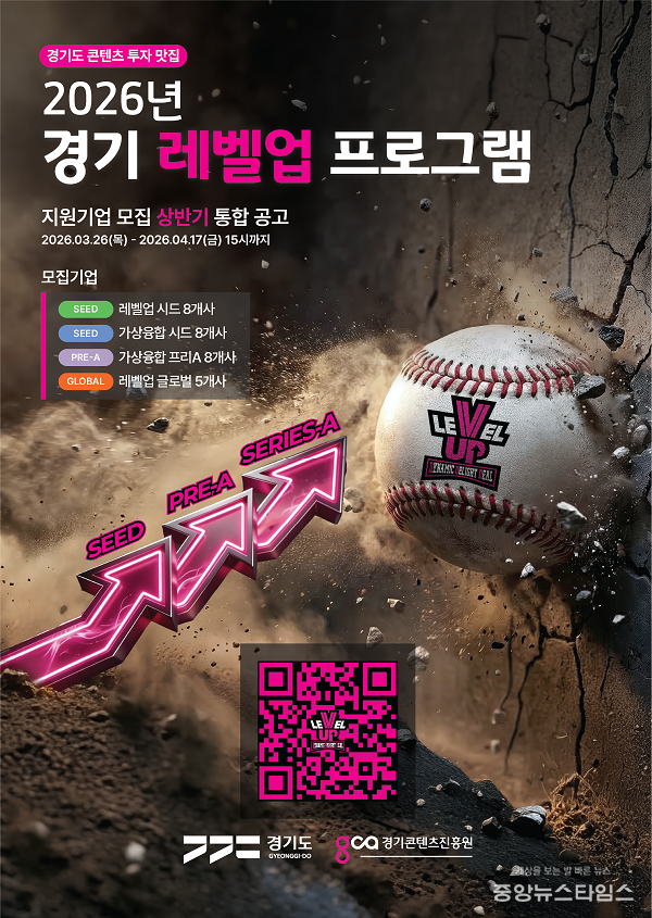 (중앙뉴스타임스 = 방재영 기자) 경기콘텐츠진흥원(이하 경콘진)은 도내 유망 콘텐츠 및 가상 융합 분야 스타트업의 맞춤형 성장과 투자 유치를 지원하기 위해 ‘2026 경기 레벨업 프로그램’ 참여 기업을 4월 17일 오후 3시까지 통합 모집한다고 30일 밝혔다.