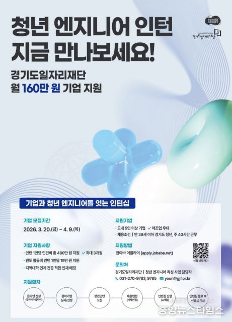(중앙뉴스타임스 = 방재영 기자) 경기도일자리재단이 ‘청년 엔지니어 육성사업 : 지역 청년 채용연계형 인턴십’ 참여기업을 4월 9일까지 모집한다. 도내 기업과 청년을 연계해 실무 중심 인턴십을 지원하는 사업이다. 최근 ‘경력직 같은 신입’을 선호하는 채용 흐름에 대응해 현장 중심 인재 양성과 기업의 채용 수요 연계를 위해 추진한다.