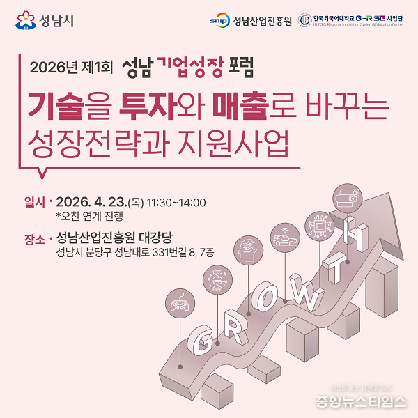 (중앙뉴스타임스 = 방재영 기자) 성남산업진흥원은 오는 4월 23일 11시 30분부터 성남산업진흥원 대강당에서 '2026년 제1회 성남기업성장포럼'을 개최한다고 30일 밝혔다. 이번 행사는 기술 기반 투자유치와 중동사태 대응 방안을 중심으로 성남 기업의 매출 성장과 글로벌 진출을 모색한다.